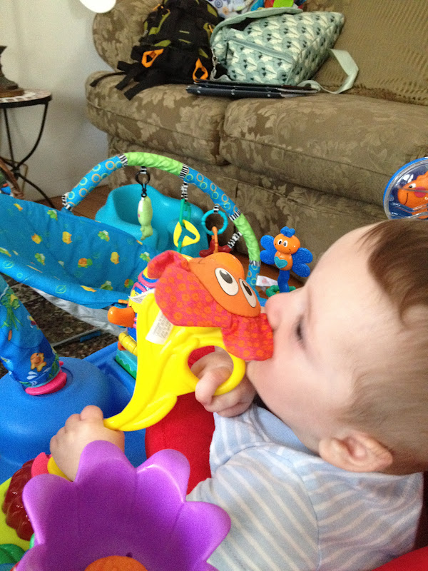 I have to separate the boys for naps or Sebastian wakes Adrian up and then neither one can go back to sleep. And last night, I didn't sleep a wink. Adrian kept waking up (but putting himself back to sleep) from 9pm-1am and then Sebastian took over and was awake and crying on and off. He whined and cried from 3-5am without stopping and finally we picked him up since we weren't sure what was wrong. Even picking him up didn't soothe him. He was screaming. Finally at around 5:45 he fell asleep on me and screamed bloody murder when I tried to put him down in the crib again. So I broke my own rule and held him until 6:30AM when I normally wake both boys. It felt nice to have a sleeping baby on me. Like I said, I NEVER do it because I don't want to make my own life harder. But I couldn't figure out what the heck was wrong with him! Hungry, maybe, but I can't start feeding him at 3AM again! Honestly, I think it's teething. He's just been so fussy and not himself. I'm sure our neighbors LOVED us last night. I did what I could! I hope tonight is a better night. It's stressing me out to have no sleep now that I have to go back to work.