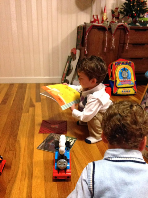 The boys didn't really seem to understand the idea of opening presents. And, Carlos had them open the Thomas presents first. They got so excited about each Thomas present that then they didn't want to open anything else; they just wanted to play with the trains. It was cute that they were so excited!